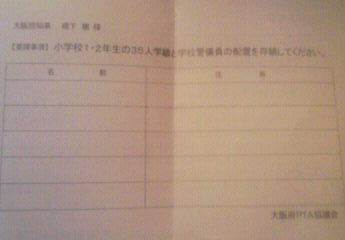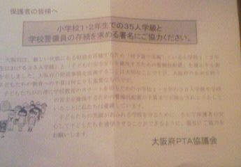 「35人学級」と「学校警備員」の存続に対する署名というのが、小学校の生徒に配られていると思います。親だけでなく近所の人に署名してもらってもいいというものです。